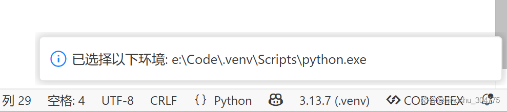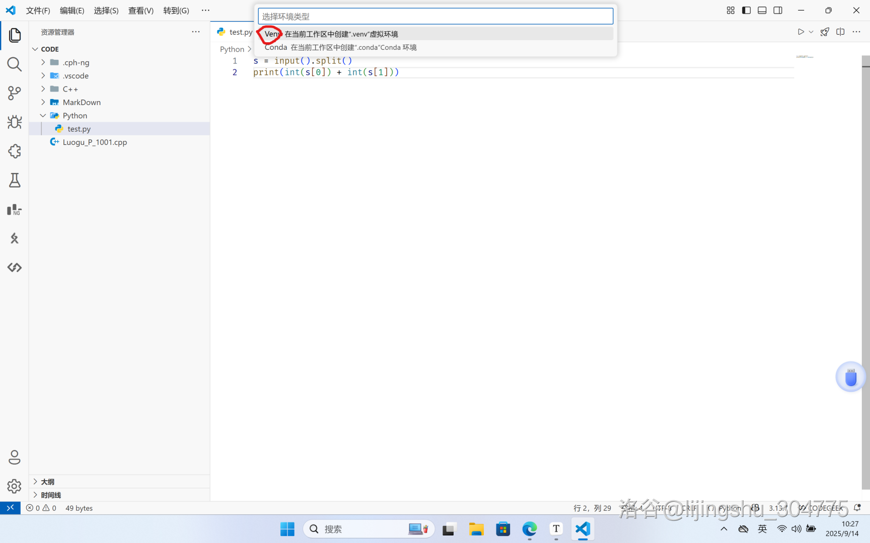 按下 Ctrl+Shift+P,输入 Python: Create Environment...。