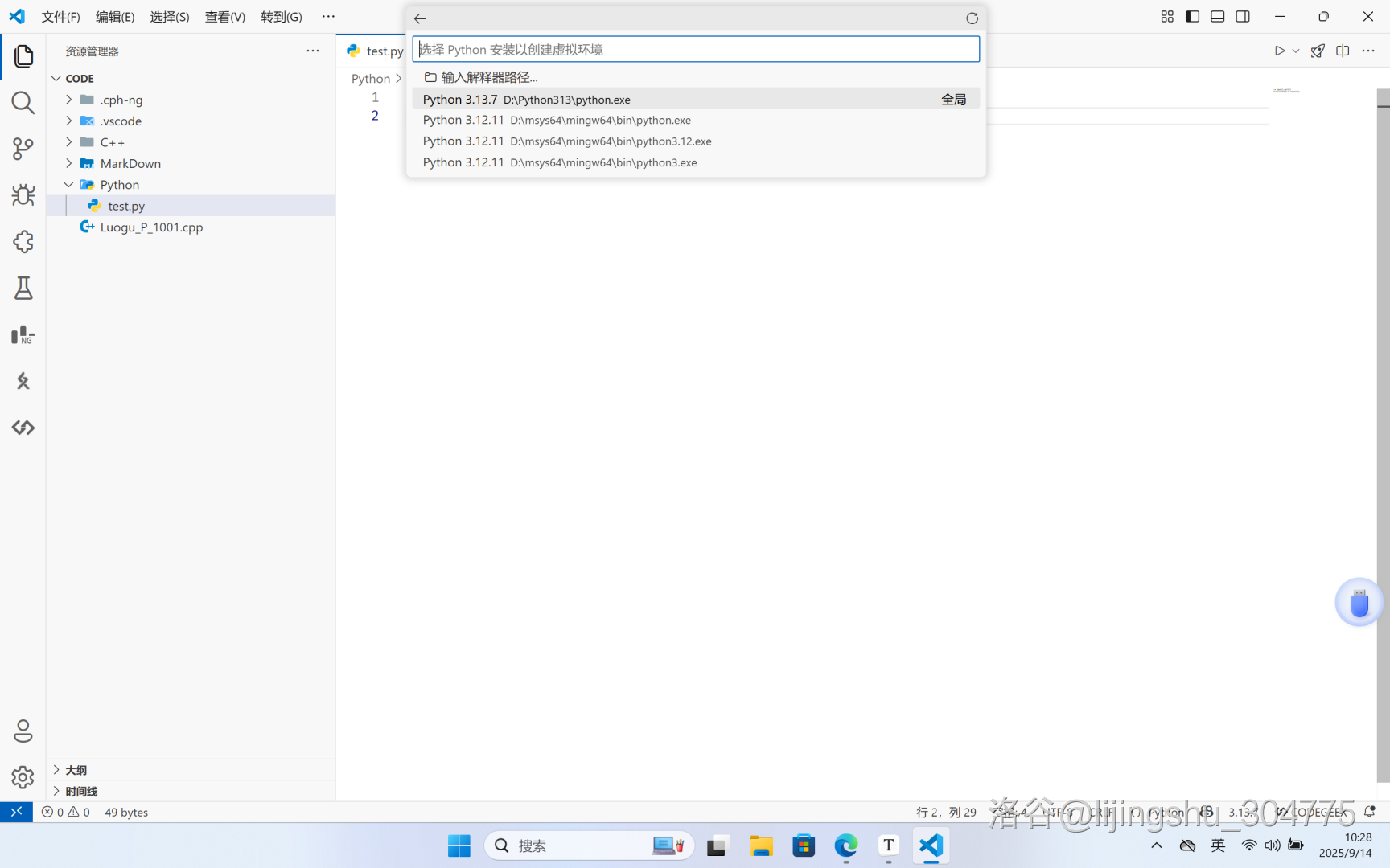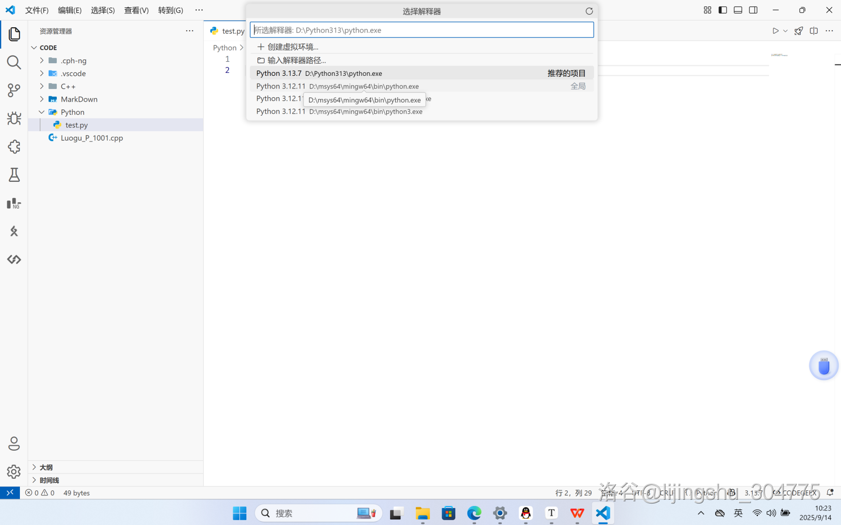 按下 Ctrl+Shift+P,输入 Python: Select Interpreter。